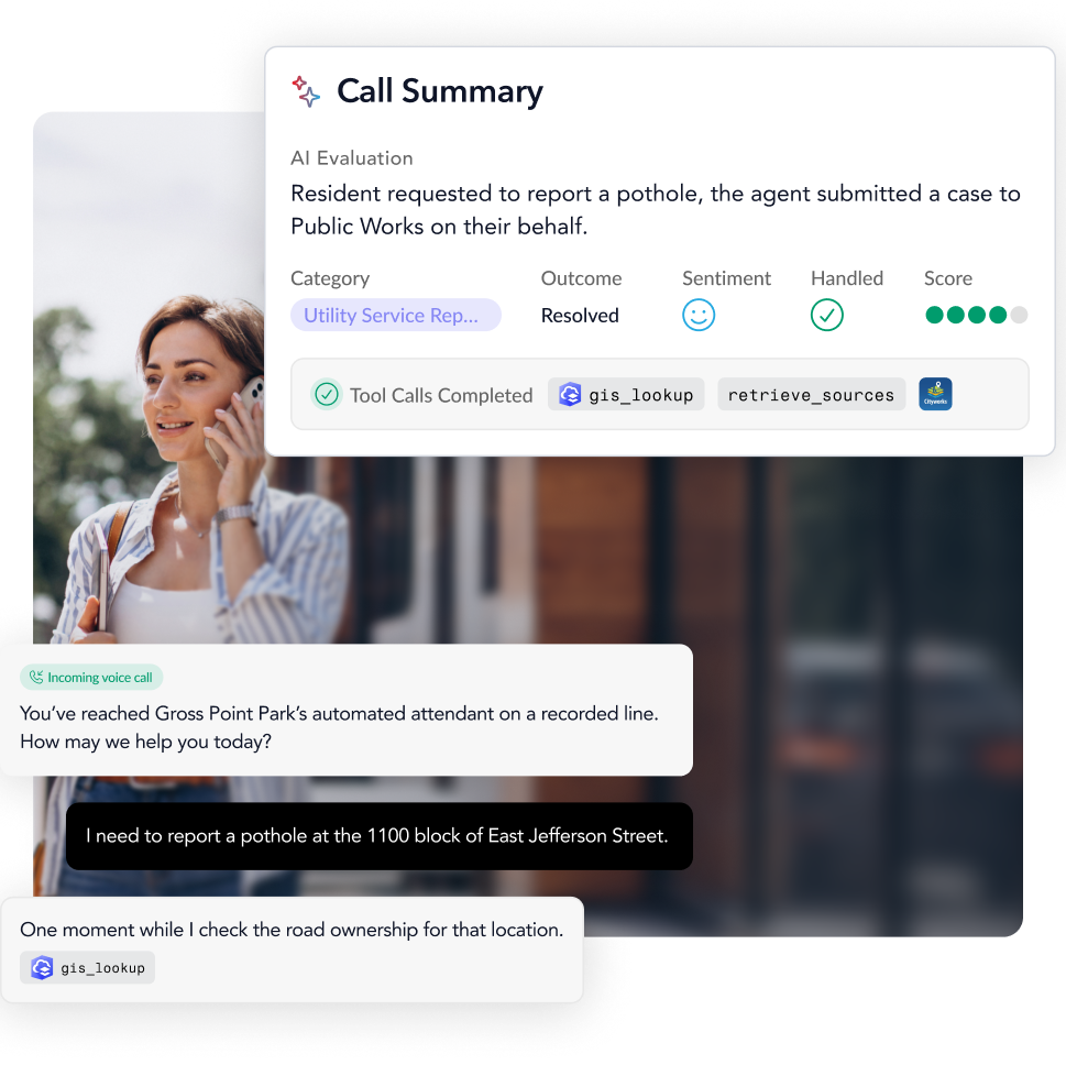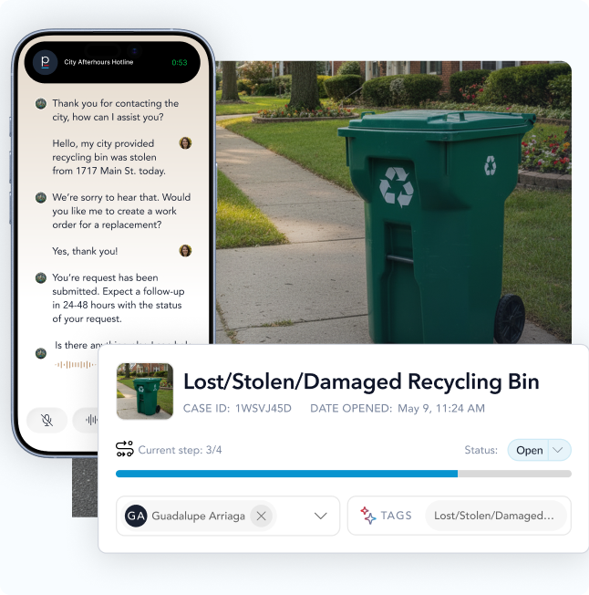 Capture service requests, permits, and incident intake by phone. Every interaction flows into the systems your team already uses to track and resolve work.